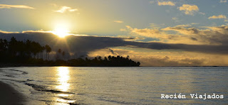 El segundo día en Moorea volvimos a despertarnos muy temprano, pero esta vez no me conformaba con ver el amancer desde la playa, quería bañarme. Nos cambiamos y salimos corriendo a la playa (totalmente desierta) y nos metimos en el agua, que estaba templadita. Desde dentro, vimos aparacer el sol entre nubes y palmeras. Una maravilla imposible de describir con palabras: